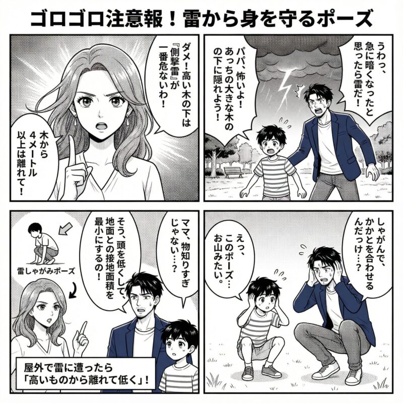 雷は「一番高い場所」だけでなく、近くにいる人にも電気が流れるため、正しい姿勢を知っているかどうかで生死が分かれます。